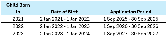 - Parent Volunteer applications for Singapore Citizen children born in 2 Jan 2021 (and 1 Jan 2022) is now closed.
